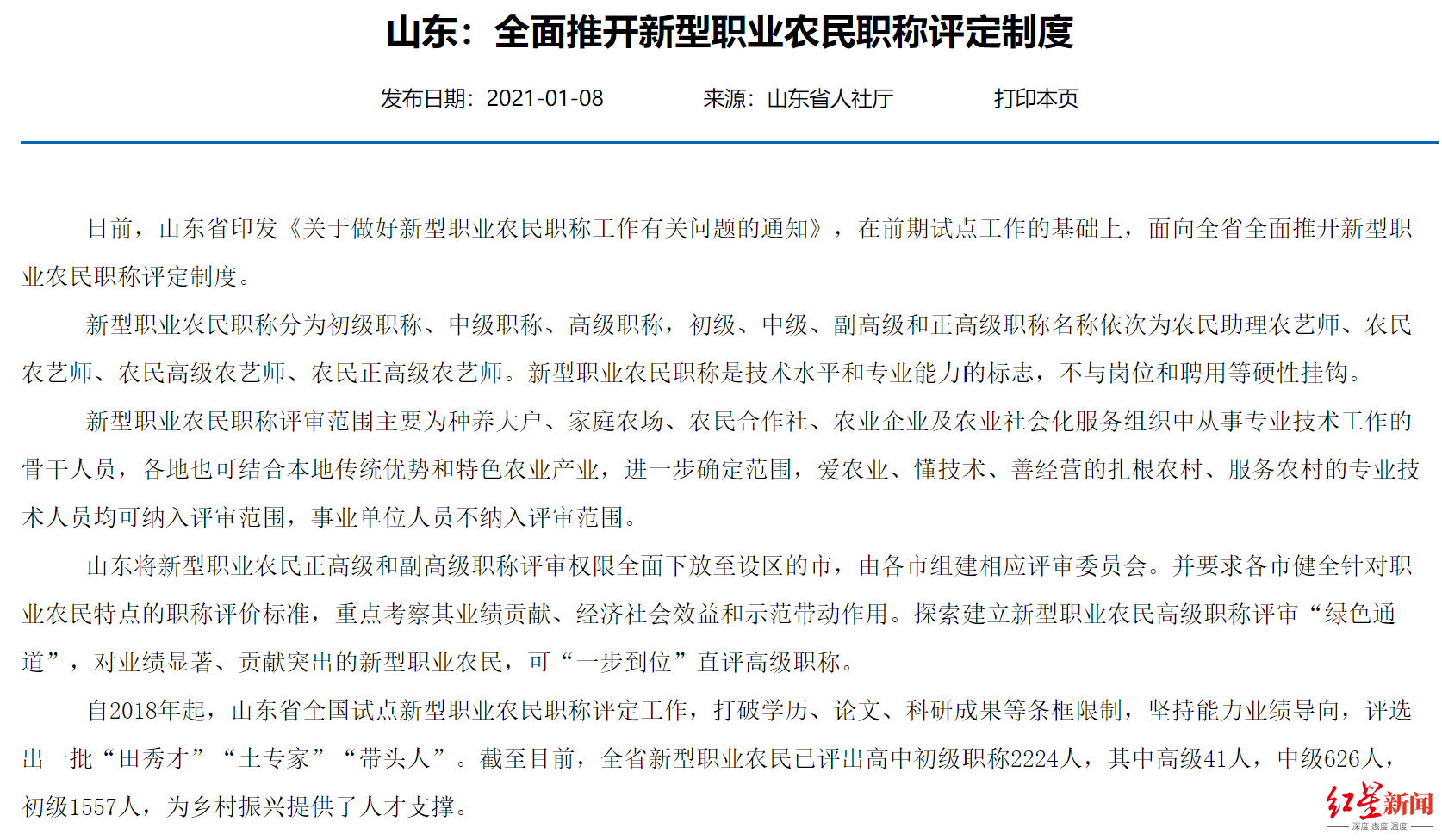 高士友告诉红星新闻记者,在新型职业农民职称评审方案出台前,国家对于农民职称也有相应规定,“主要针对乡镇上雇佣的农业技术人员,申报条件也较为严苛。”