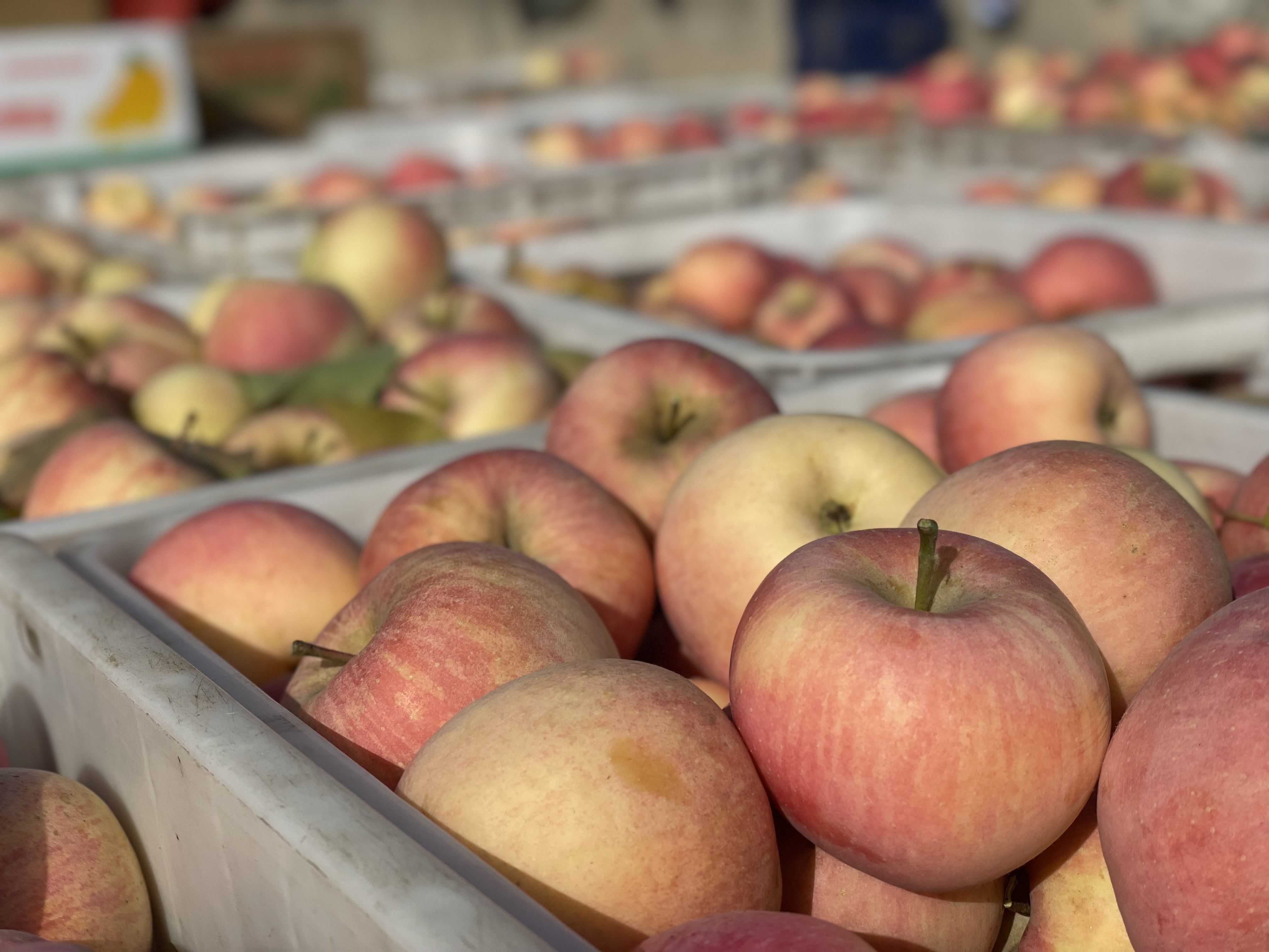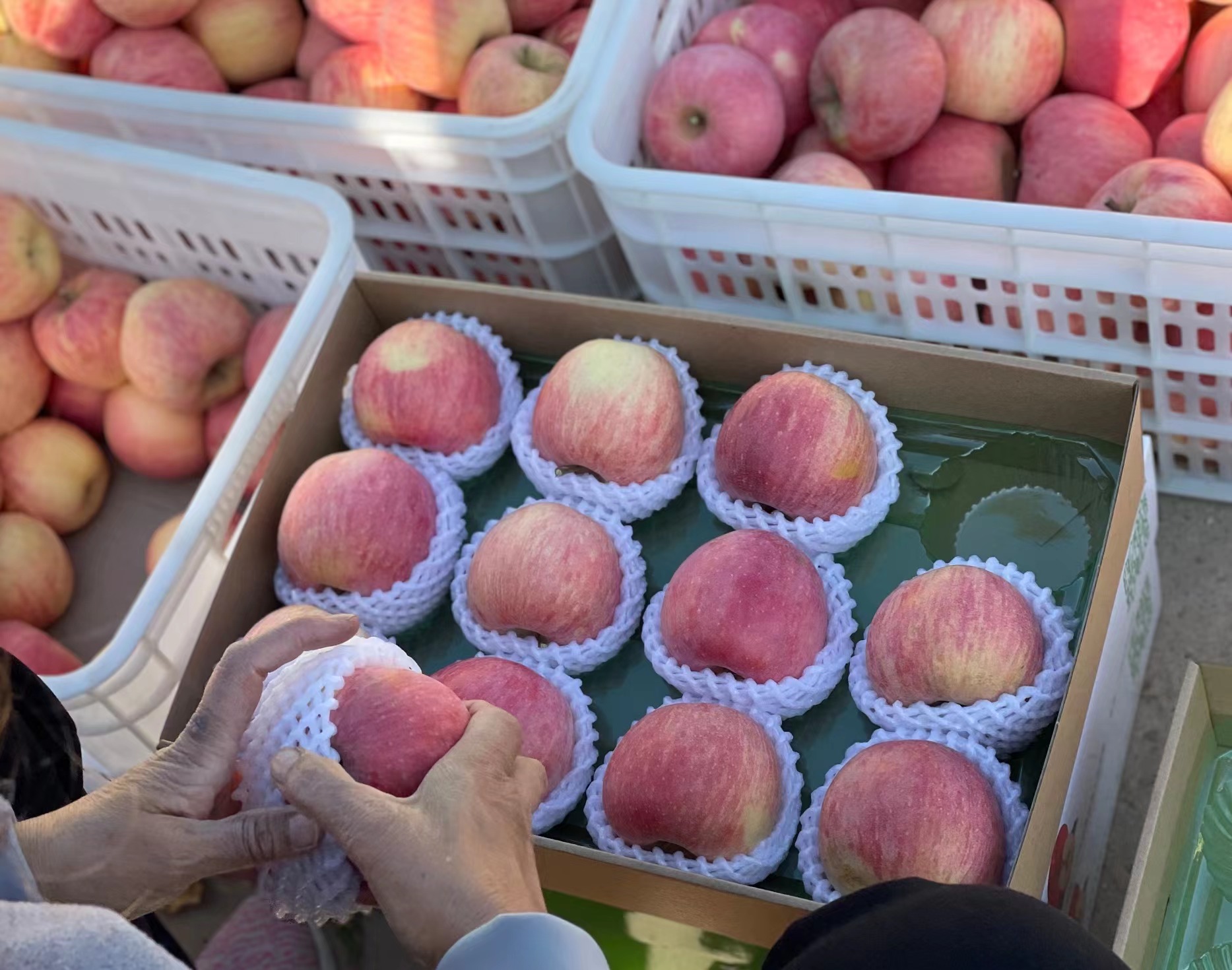 一筐筐苹果填满了园区内的平地空场,李淑芳坐在马扎上猫着腰,在苹果堆儿里挨个分拣,个头儿相对小一些的装进塑料袋,3元一斤,已经有不少社区预订,个头大些的装进纸箱、精品盒,这一早已经卖出了100箱。