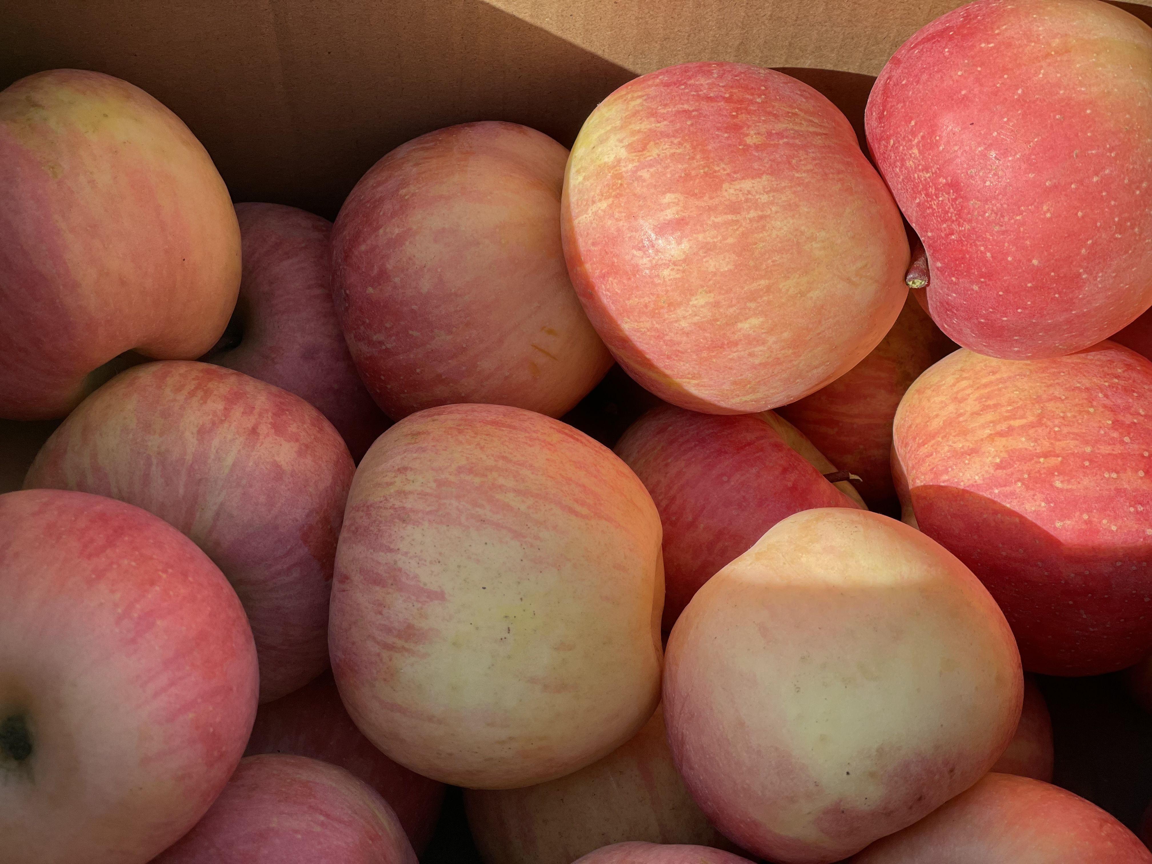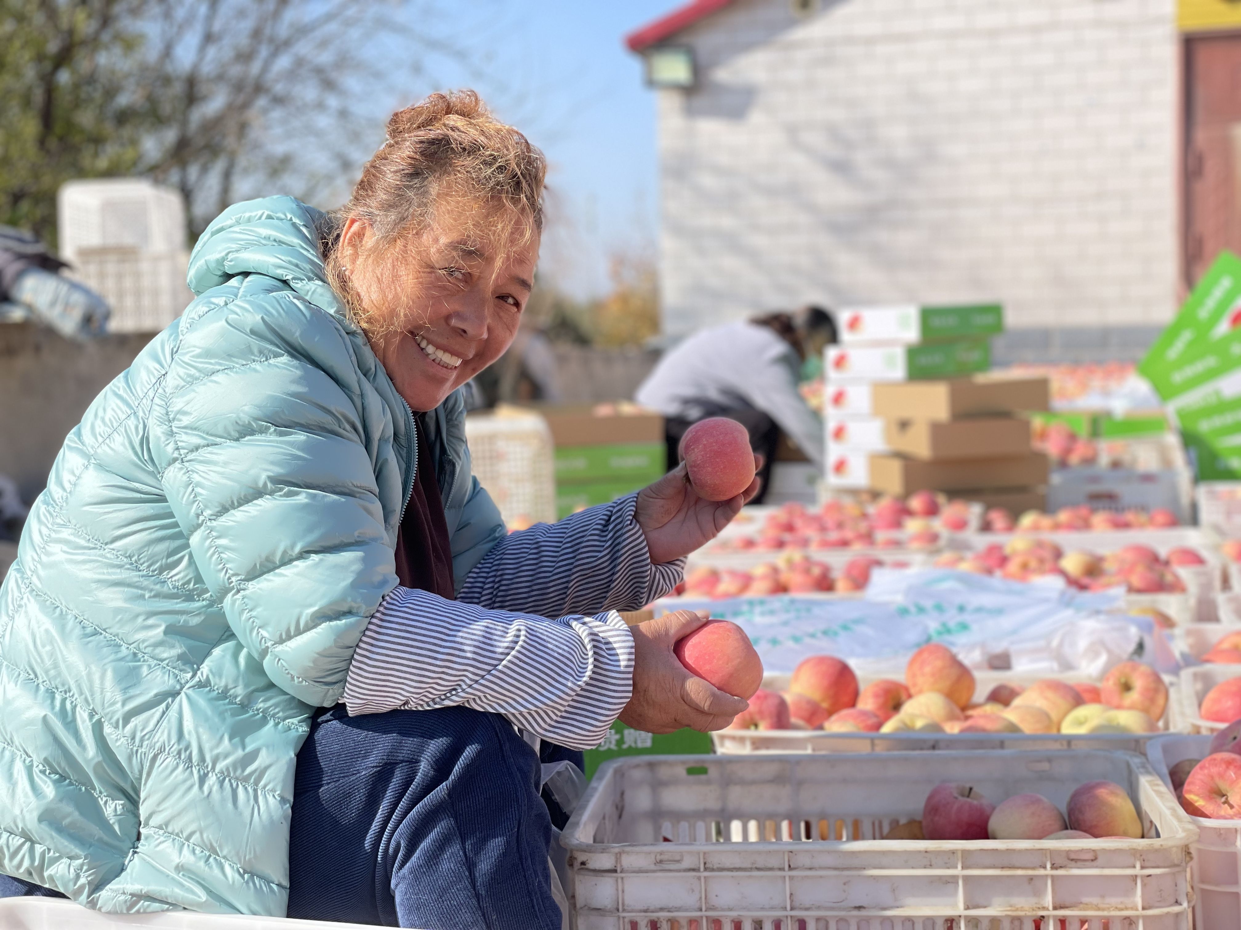 上午十点,已是李淑芳开始这一天工作后的第五个小时。早上温度低,穿的还是薄羽绒服,快到晌午,太阳暖洋洋的,温度上来了,额头上就会出一层细密的汗。“苹果都是这一半天刚刚摘下来的,我们每天就得过手一万多斤。”她干活麻利,和苹果打了三十多年交道,眼睛是尺,双手是秤,苹果一上手,几斤几两心里就有了数。心无旁骛的时候,单单三五分钟,就能分拣出满满一整筐。不过大多数时候,这样的手速还是会被各种订购电话和微信打断。