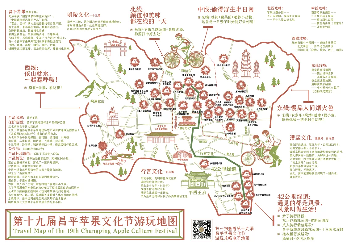 “我们充分调动基层合作社、种植大户销售积极性,在果品集中收购、储运、分选分级等环节给予资金奖励支持,鼓励引导形成全区果品销售龙头和品牌企业,搭建‘互联网+苹果’立体销售网络,在传统苹果进商圈、进社区、进企业的基础上,利用网络直播和短视频平台,开启‘驻场直播带货’零售模式。”耿军介绍,今年昌平还策划推出“东、中、北、西线”等4条观光采摘路线。记者也注意到,这4条路线不只联通着昌平苹果的集中种植区,也将附近的文旅点位贯穿其中。耿军说,这将全面展示昌平独具特色的城市魅力、发展优势和生态环境,让更多市民游客感受文旅融合发展成果和京郊旅游魅力,为苹果销售提供新动能。