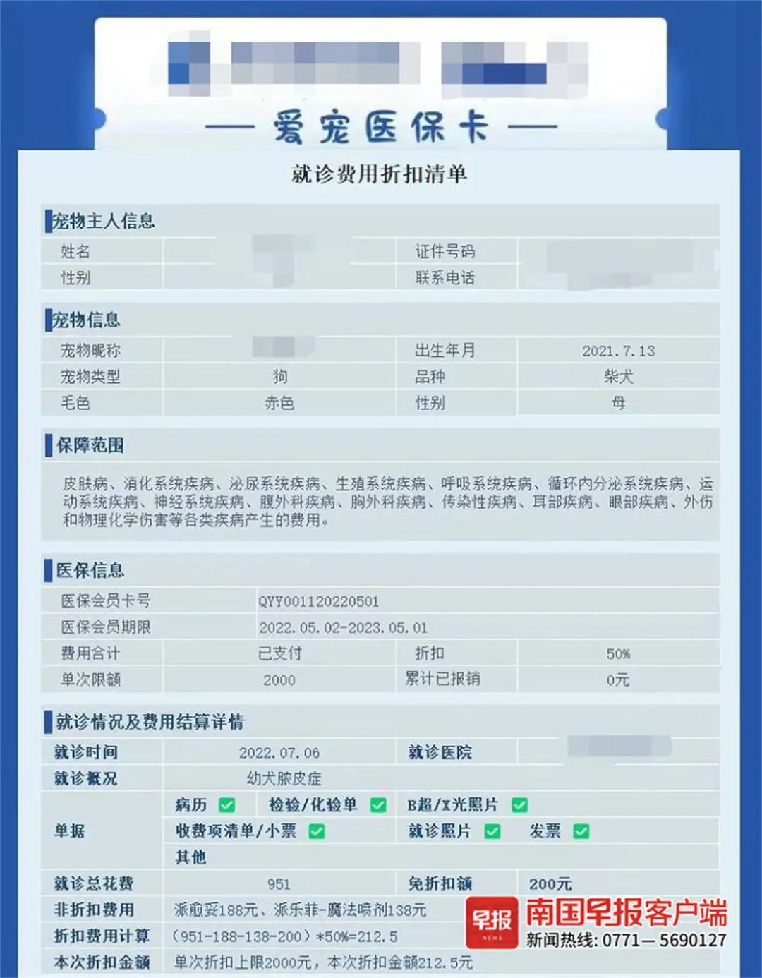 在后续宠物皮肤病治疗过程中,黄女士发现,951元的治疗费用在理赔时,不仅要去除200元的免赔金额,还有两款外用喷雾不属于药品范围,无法纳入理赔金额,实际赔付金额仅有212.5元,与宣传中的“看病享5折”存在较大差距。