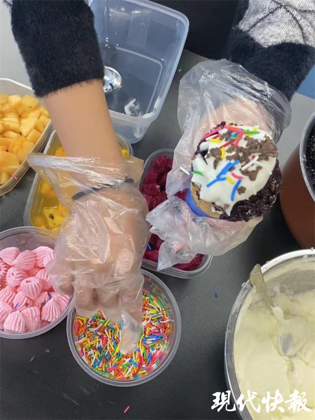 由于流动摊位总是让人跑空,食品卫生也没法保证,不少网友开始自制热奶宝。只需要一个脆筒、打发的奶油和黑糯米,一个简易版热奶宝就做好了。在南京工作的小江告诉现代快报记者,最近,他们公司在休息空隙有同事自备材料在办公室做起热奶宝,同事们争先前后地来“点单”,“同事自制的热奶宝味道也很不错,一个小小的甜点好像让办公室的氛围都变得更轻松融洽了。”小江说。