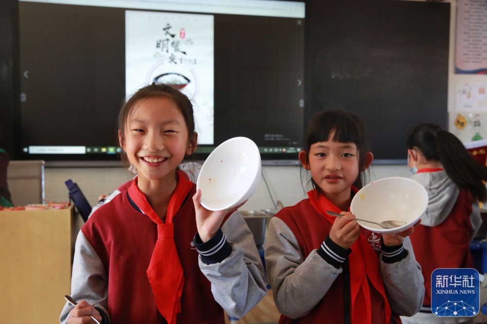 11月11日,在云南省曲靖市第一小学四年级6班教室,小学生在展示吃干净的饭碗。新华社发(段娟摄)