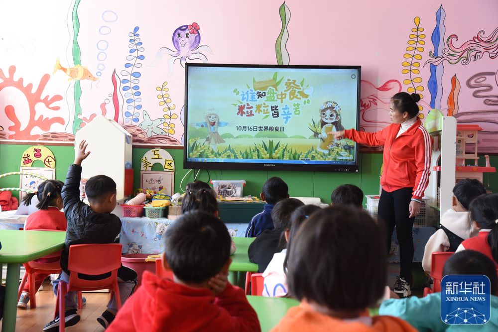 11月10日,云南省丽江师范高等专科学校附属新苗幼儿园的老师向孩子介绍珍惜粮食的知识。新华社发(赵庆祖摄)