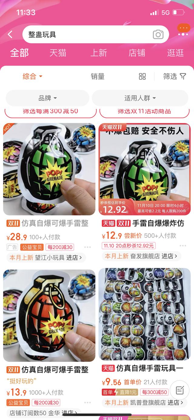 记者在某网购平台上搜索整蛊玩具,自爆手雷销量在此类玩具销量排行中靠前。大多打着“仿真手雷”、“空气充气球”、“变态恶作剧玩具”等标签进行售卖。