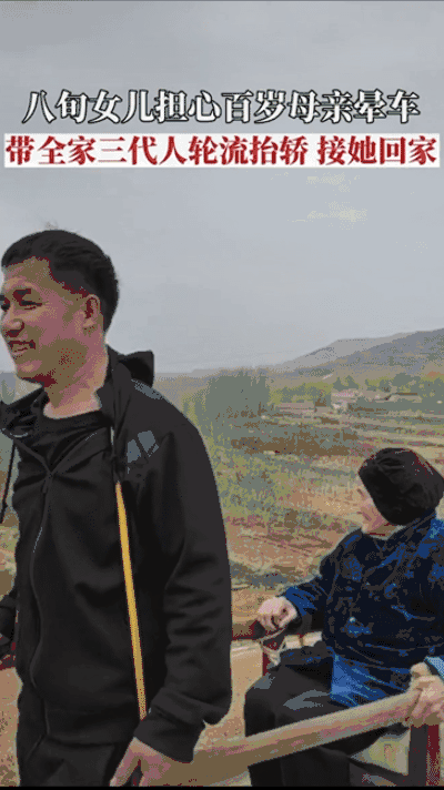 近日,张先生开车去姑姑家接98岁的奶奶回家,进村后由于路太窄,车开不进去,张先生的爸爸一把背起老母亲,将她一路背回家。