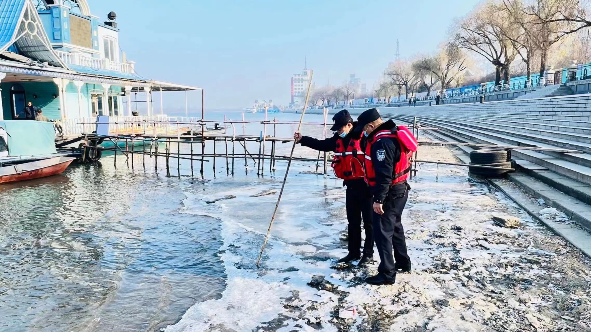 哈尔滨市公安局航运分局在此提示广大市民、游客,不要在冰面上行走、玩耍,远离冰面,注意安全。