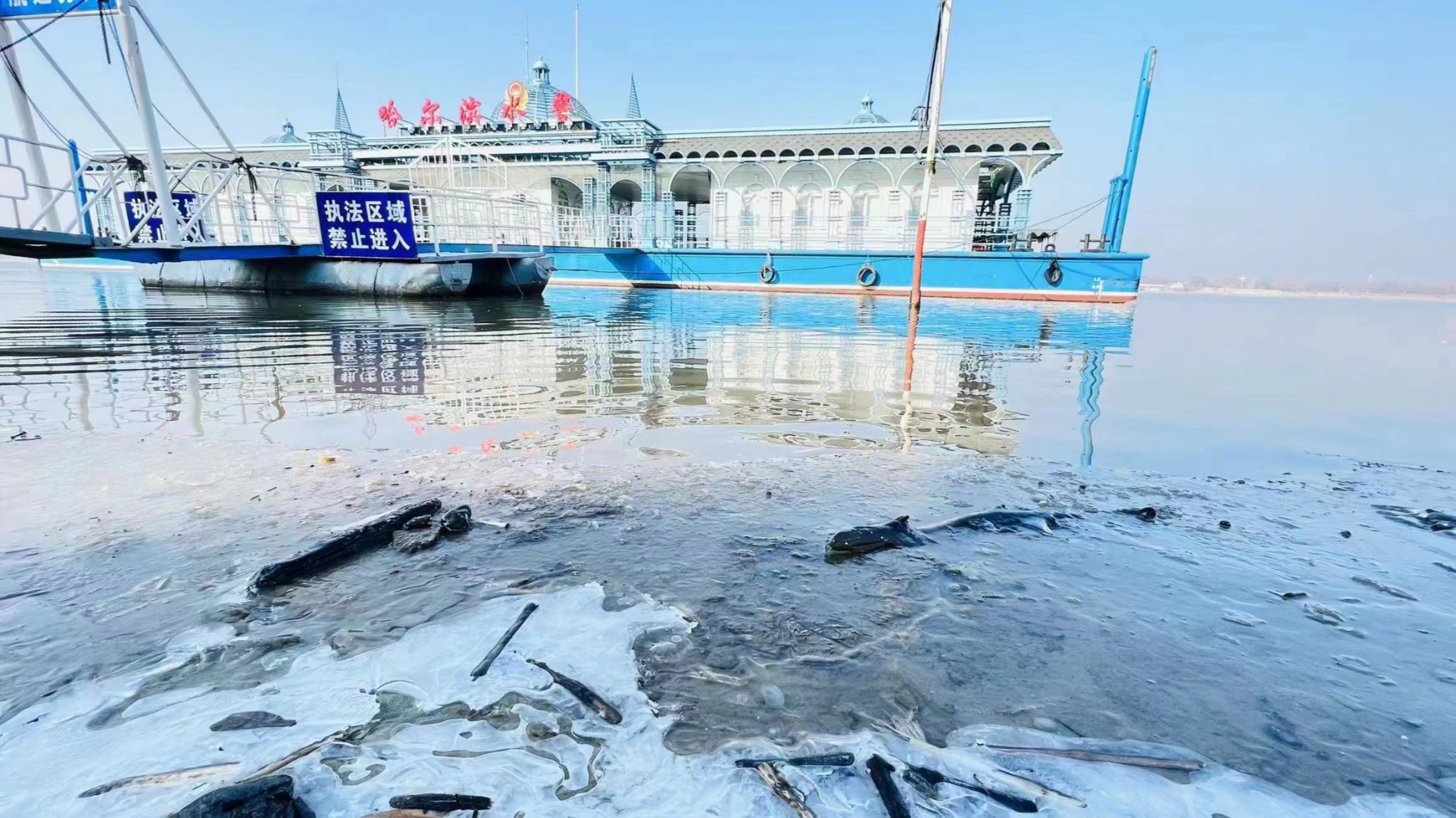 目前冰面承载能力低,冰面活动危险性大(央广网发哈尔滨市公安局航运分局供图)