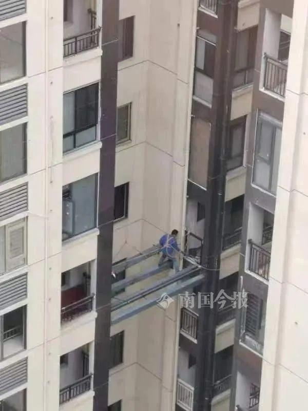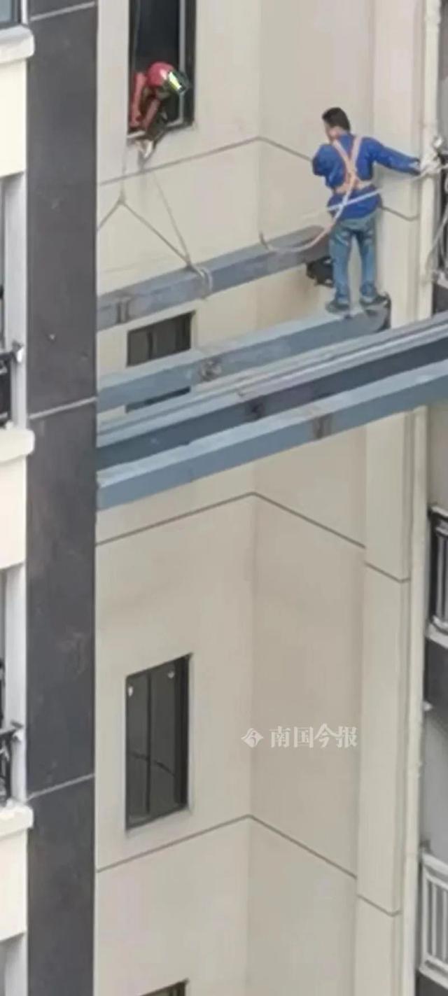 画面中显示,在一栋高层住宅楼的两面外墙之间,被人搭上了几根巨大的横梁,看起来有四五米长。上面有工人绑着安全绳,在这“空中独木桥”上来回走动施工,在横梁上安装钢管。