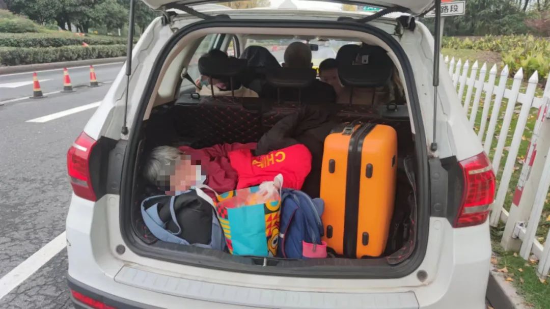 不看不知道,一看吓一跳!只见一名头发花白的老婆婆正枕着行李躺在后备箱里。面对交警的询问,张某解释道因为自己一家子人要回老家,车前面抱了个小孩,坐不下人了,只能让自己的母亲躺在后备箱里。