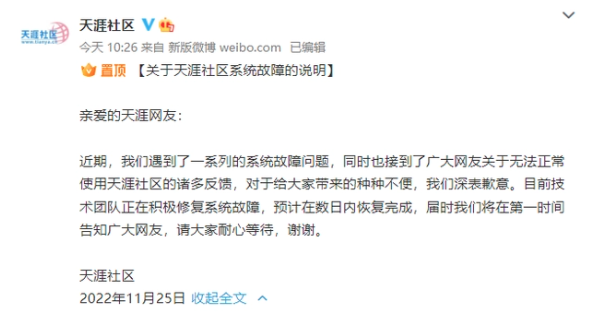 在#天涯论坛不能访问#登上热搜后,天涯社区随后在微博上发布声明称,停更是因为“遇到了一系列的系统故障问题”,同时也接到了广大网友关于无法正常使用天涯社区的诸多反馈,对于给大家带来的种种不便深表歉意。“目前技术团队正在积极修复系统故障,预计在数日内恢复完成,届时我们将在第一时间告知广大网友,请大家耐心等待。”