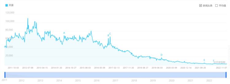 上游新闻从百度搜索指数看到,2011年至今,“天涯”的搜索指数在2012年、2013年左右到达顶峰,此后指数小幅下降,并呈现稳定状态直到2015年底、2016年初。但这之后,“天涯”的搜索指数便持续下跌,直到现在。