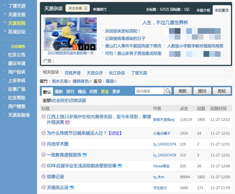 近日,有网友发现,天涯论坛目前已无法发帖,论坛帖子的最后回复时间停留在了2022年11月22日18时。微博话题#天涯论坛不能访问#突然就登上了热搜,天涯社区真的要凉了吗?