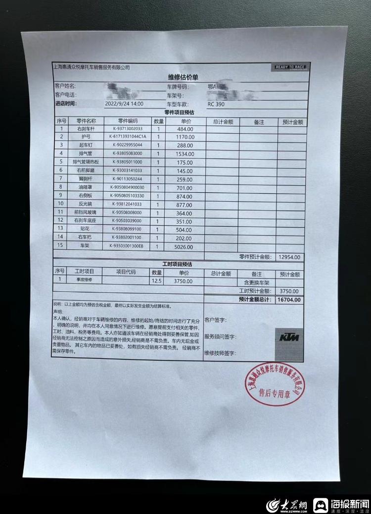 期间,司法鉴定部门重新对摩托车进行鉴定,定损为4000多元。陈明对此产生异议,他与物价部门和司法鉴定中心的工作人员再次前往4S店,最终确认所有的维修费用为16000多元,司法评估价格为9000多元。“从7月1日第一次定损,到9月底最后一次鉴定出结果,花了两个月的时间。”