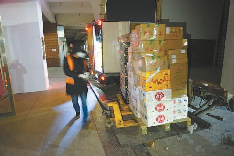3点,货车驶入泰河园店的停车场。张志辉倒车,将货车后门紧贴超市入口。北风呼啸着穿过空空荡荡的街巷,戴着帽子、手套、口罩的张志辉,裹得严严实实。通过小程序进行一系列验证,超市入口的电子锁随即开启。
