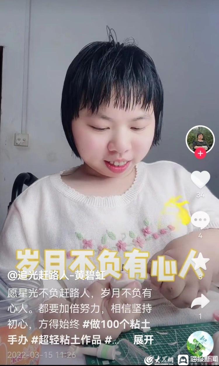 除此之外,黄碧虹说,她的生活并没有什么改变。“我大部分时间都在做粘土手工,只是想要做得更好的决心更大了,积极生活下去的信心也更多了。网友对我的鼓励和支持,让我发现原来有这么多人理解我,知道我这么多年的不容易,让我更加确信自己活着的意义。”