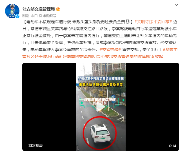 近日,常德市城区芙蓉路与竹根潭路交汇路口路段,李某驾驶电动自行车遇范某驾驶小车正常行驶至该处,由于李某未在辅道内通行,辅道变更主道时未让相关车道内的车辆先行,且未佩戴安全头盔,导致两车相撞,造成李某头部受伤的道路交通事故。经交警认定,电动车驾驶人李某负事故的全部责任。交警提醒:遵守交规,安全出行!