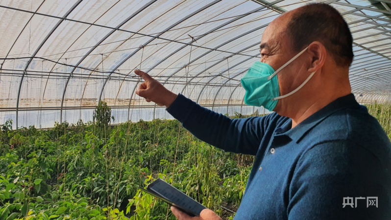 种植户正在通过手机操控大棚卷帘机的升降(央广网发马丽娟摄)