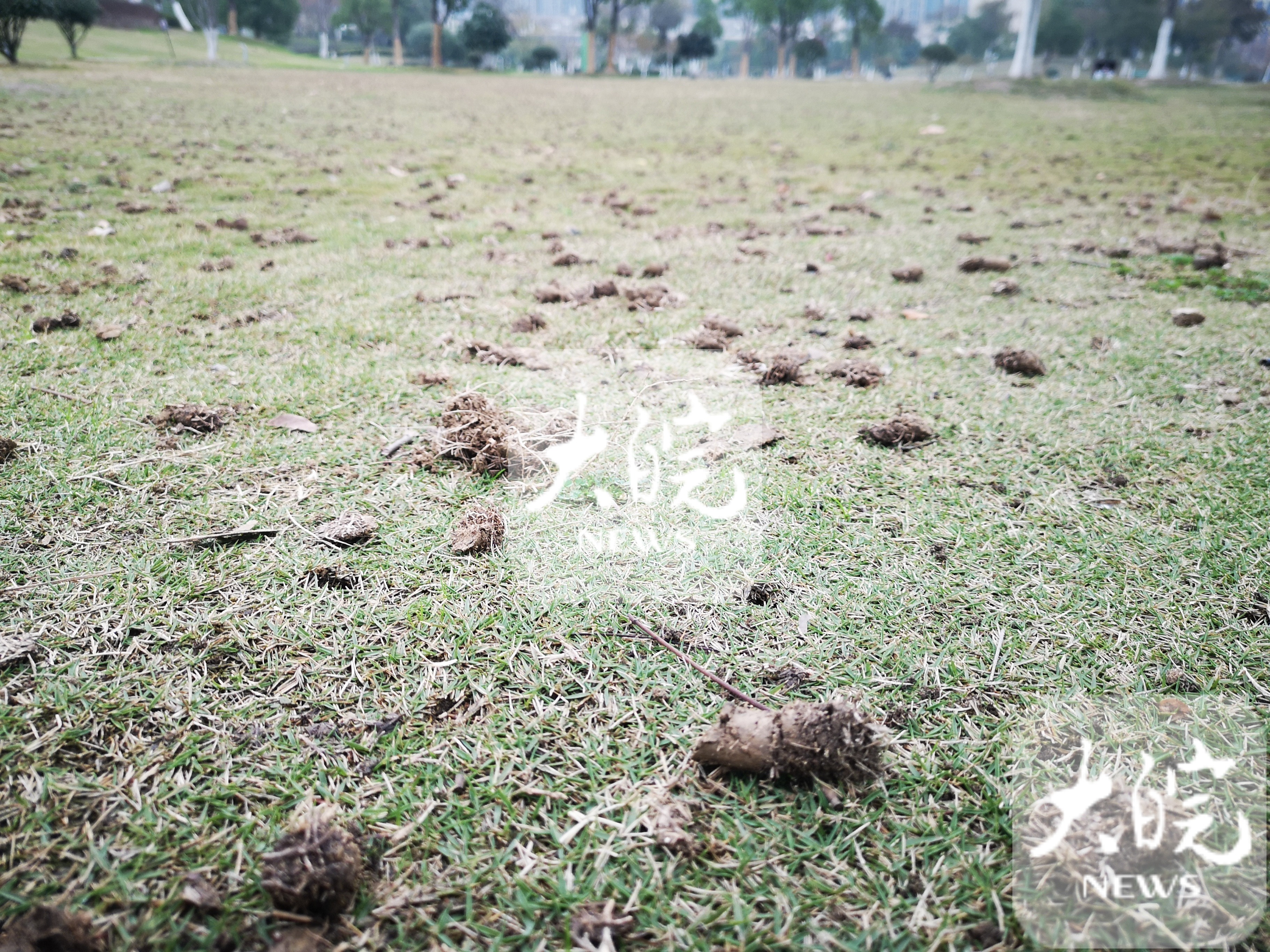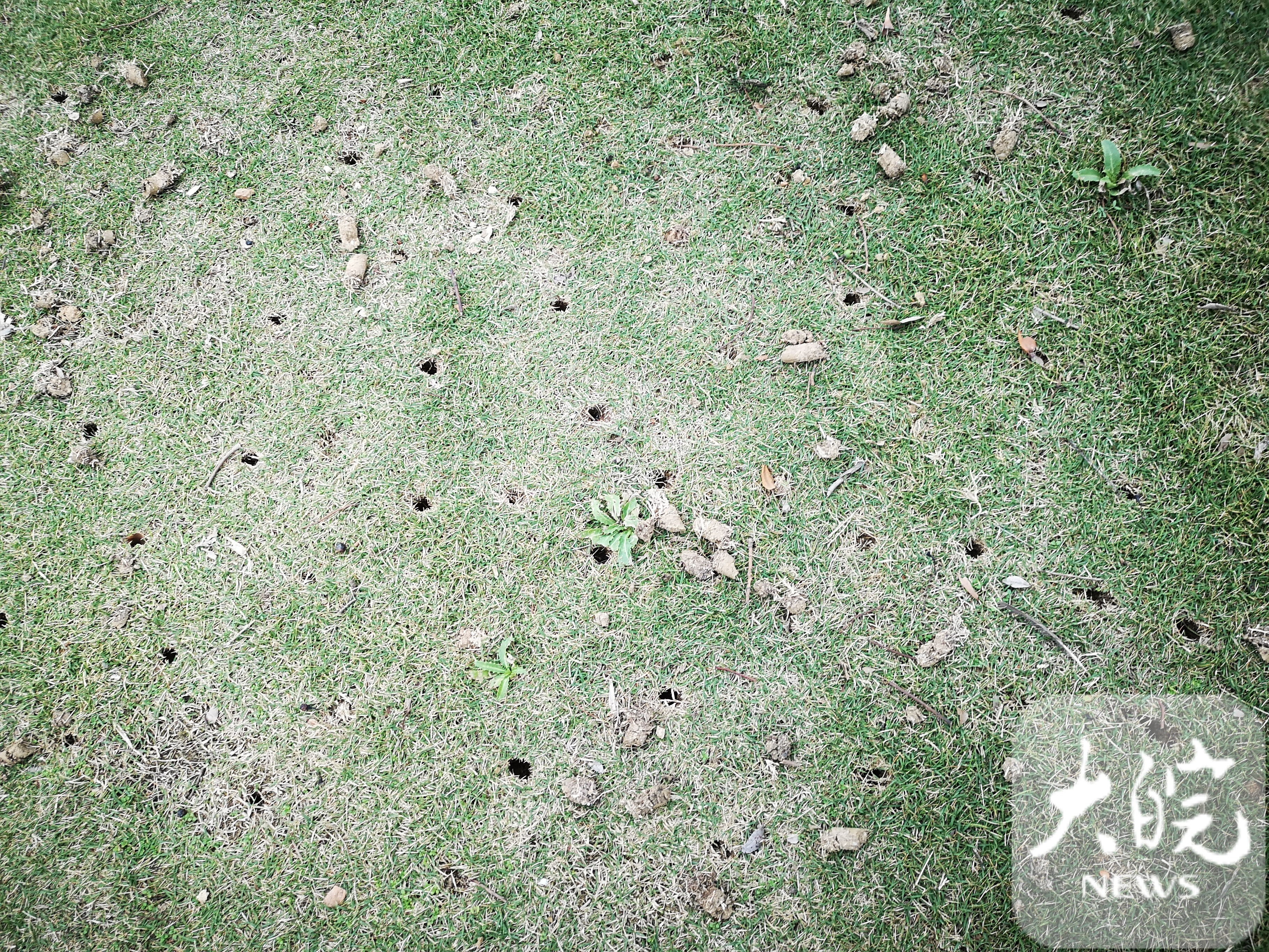 李女士家住滨湖新区塘西河公园附近,喜欢和家人在此散步。李女士告诉记者,上周末,她和家人看到草坪上散落着像木塞一样的东西,“一开始以为是狗的便便。”当走近后,她发现草坪上还有不少的小洞,“难道是扎帐篷弄得,这太不合适了。”