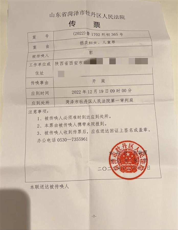 12月12日,菏泽市牡丹区人民法院给郭丽提供的传票显示的案由为拐卖妇女、儿童案,开庭时间为12月19日上午9时。