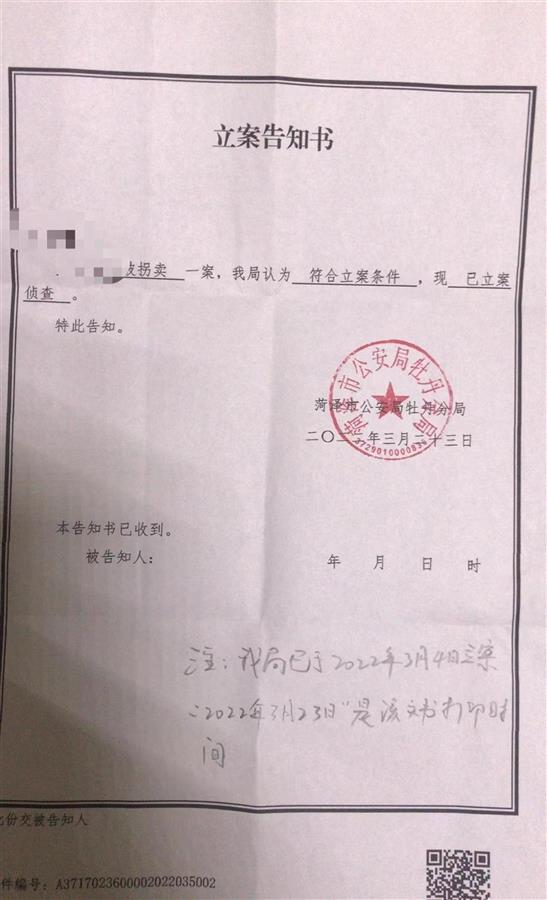 郭丽向山东警方报了案。2022年3月23日,菏泽市公安局牡丹分局出具立案告知书,郭丽被拐卖一案符合立案条件,现已立案侦查。此时,距离她被拐卖已过去35年。