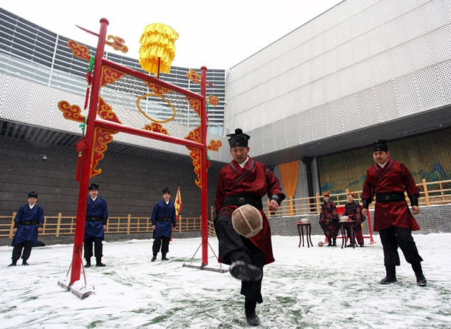 现代足球就起源于我国古代的蹴鞠。“蹴”即用脚踢,“鞠”指皮制的球,“蹴鞠”就是用脚踢球。2300多年前春秋齐威王时期的临淄,蹴鞠就是最时髦的运动。如今,位于淄博临淄的足球博物馆,既能让游客们看到蹴鞠表演,也能购买到蹴鞠纪念品。小小的蹴鞠,承载着2300多年的历史,让厚重的中华文明展现出灵动活泼的一面。