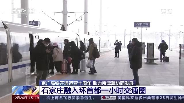 京广高铁开通运营十年来,不仅便利了民众出行,也带动了沿线区域的经济发展。河北石家庄市是京广线的重要枢纽。随着今天全国铁路列车运行图的调整,京广高铁再提速,石家庄也正式融入环首都一小时交通圈,石家庄至承德运行时间进一步优化压缩,并开行石家庄至廊坊高铁直达列车。河北省高铁通达性便利性进一步提升,将给京津冀协同发展提供新动能。