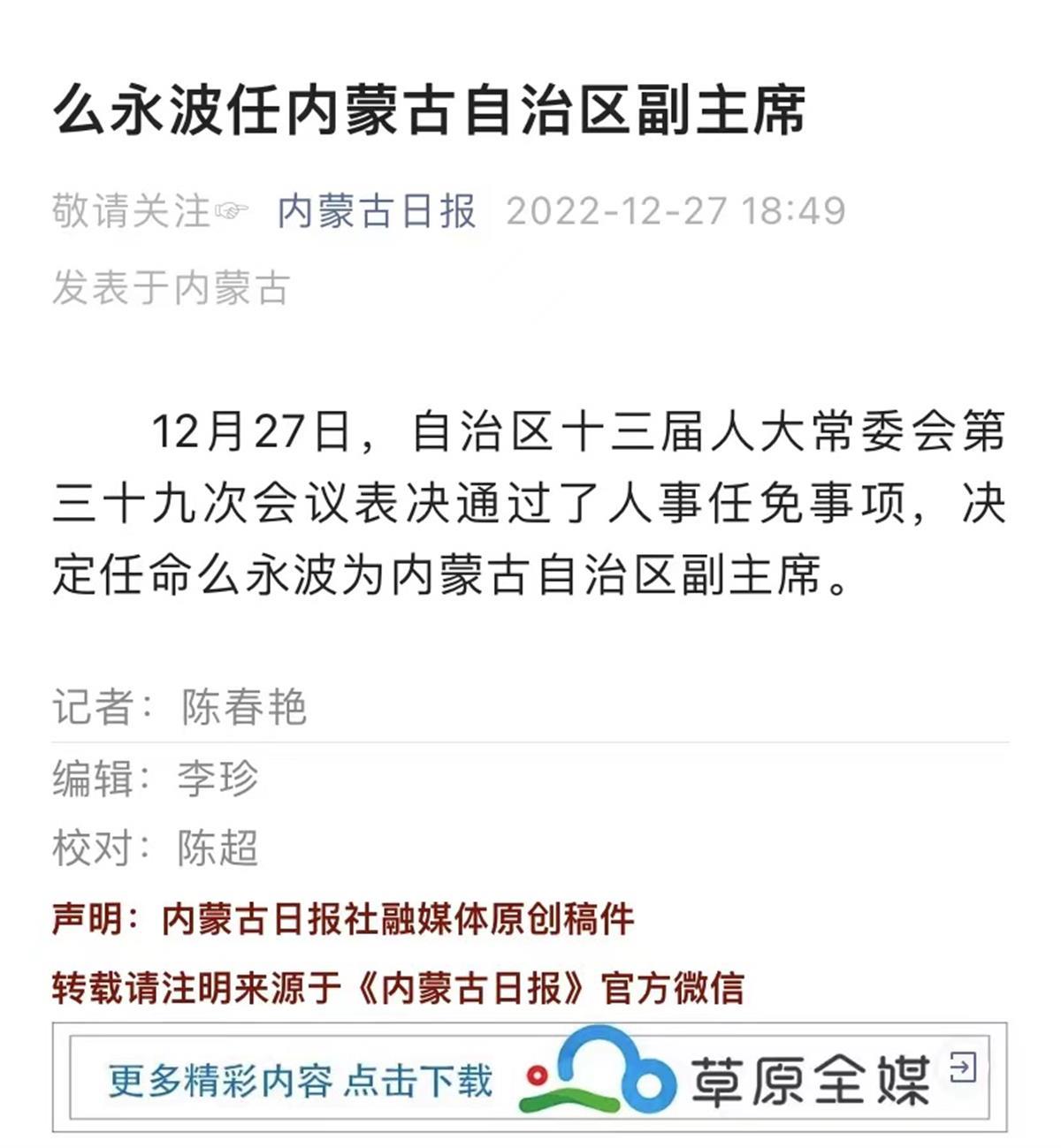另据中国经济网12月21日消息,内蒙古自治区政府官网“政务公开”栏目更新显示,么永波已任内蒙古自治区政府党组成员。