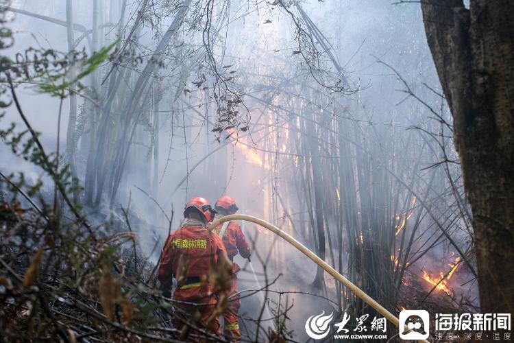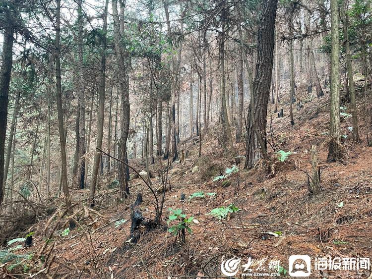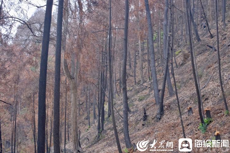 几个月过去,树林被山火肆虐后燃烧的痕迹依旧明显,只有林间低矮的灌木草丛长出几丝新绿。图/海报新闻记者邓波摄