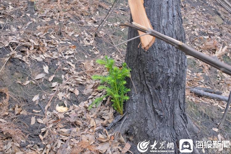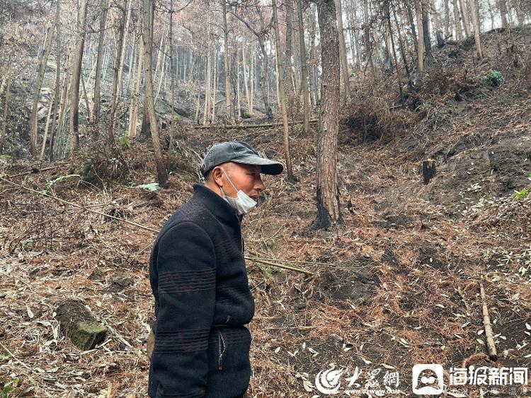 跟着汪志林从起火点向山上走去,被山火肆虐过后的树干依旧黝黑,部分树木根部生出幼苗,林间低矮灌木草丛也长出几丝新绿,但依旧让人感到荒凉。在山上,多位村民将被烧毁的树木收集起来,扛回家当作柴火,对于曾经发生的那次山火,他们的印象都极为深刻,也颇为心痛。汪志林指着一棵被烧过的杉树告诉海报新闻记者,这棵直径30公分的杉树已经无法存活,他拿起随身携带的弯刀砍向杉树,树皮干枯,与树干彻底分离。汪志林说,这生长了10多年的杉树已经彻底死亡了。