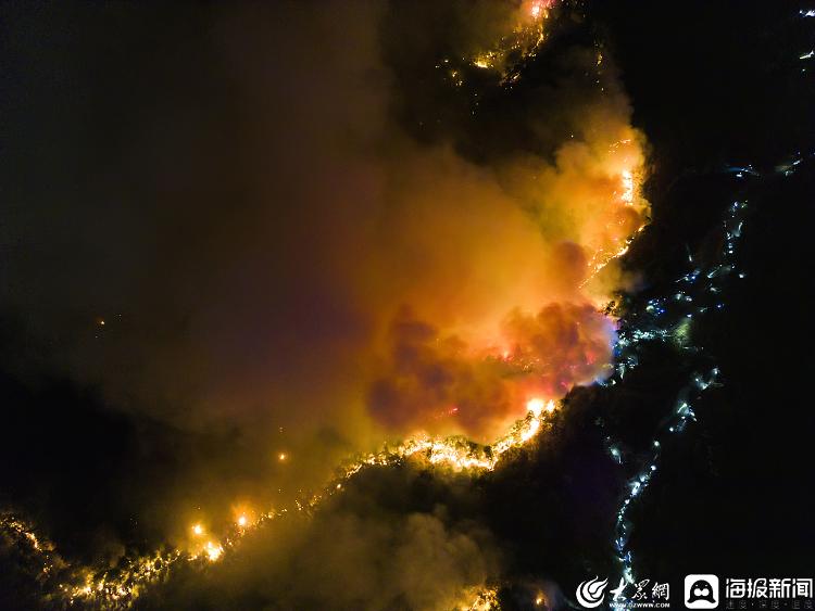 2022年8月25日晚,决战时刻,由森林消防员、武警官兵、灭火队员及志愿者的头灯形成一条光带,与迎面而来的烈焰形成对峙。图/视觉中国