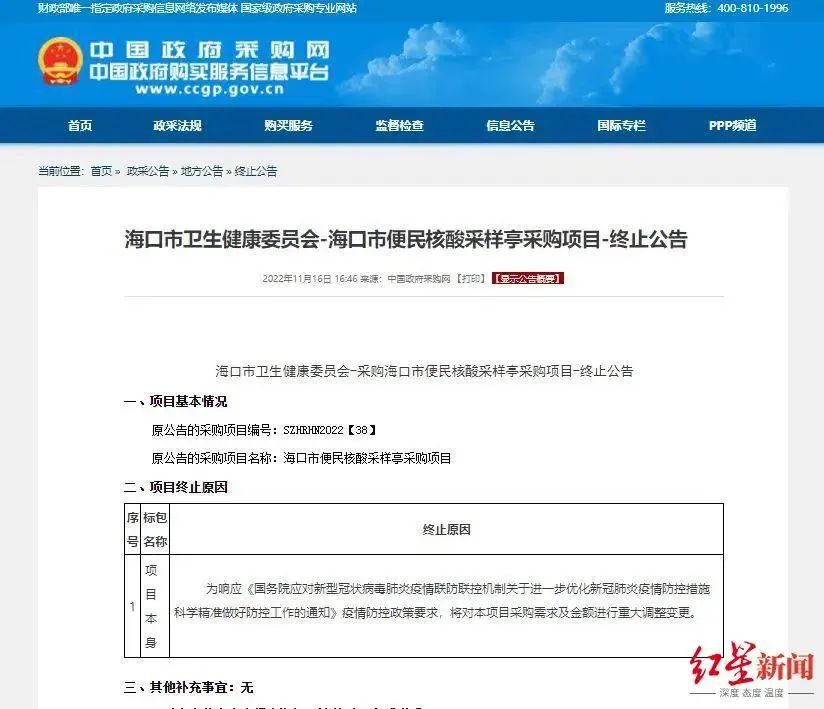 11月16日,海口市卫生健康委员会采购海口市便民核酸采样亭采购项目也发布了终止公告,该投标原本计划预算300万元,而终止采购的原因为“为响应《国务院应对新型冠状病毒肺炎疫情联防联控机制关于进一步优化新冠肺炎疫情防控措施科学精准做好防控工作的通知》疫情防控政策要求,将对本项目采购需求及金额进行重大调整变更”。