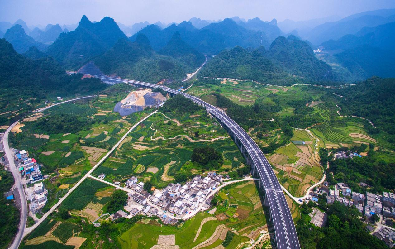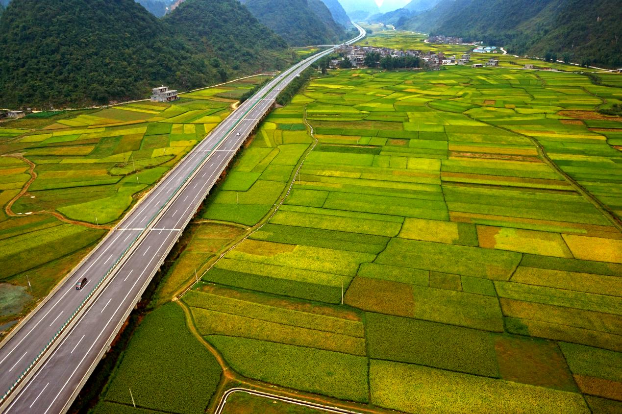 行驶在在合那高速上,连绵起伏的喀斯特山脉、纵横交错的农田阡陌、掩映在葱郁林间的农家屋舍不断从眼前掠过,变化的景致与蓝天白云交相辉映,仿如一幅美好的山水画卷在徐徐展开。