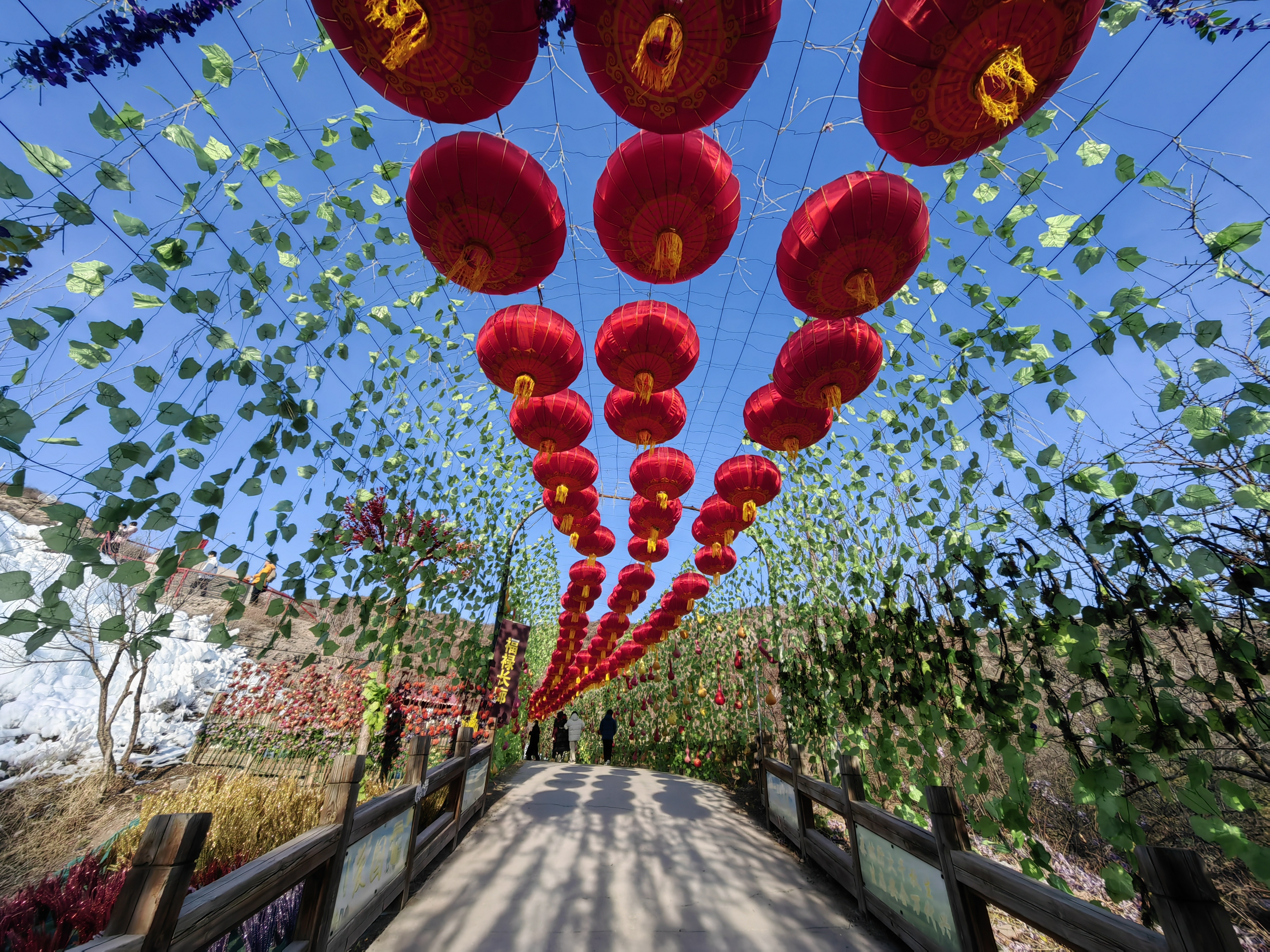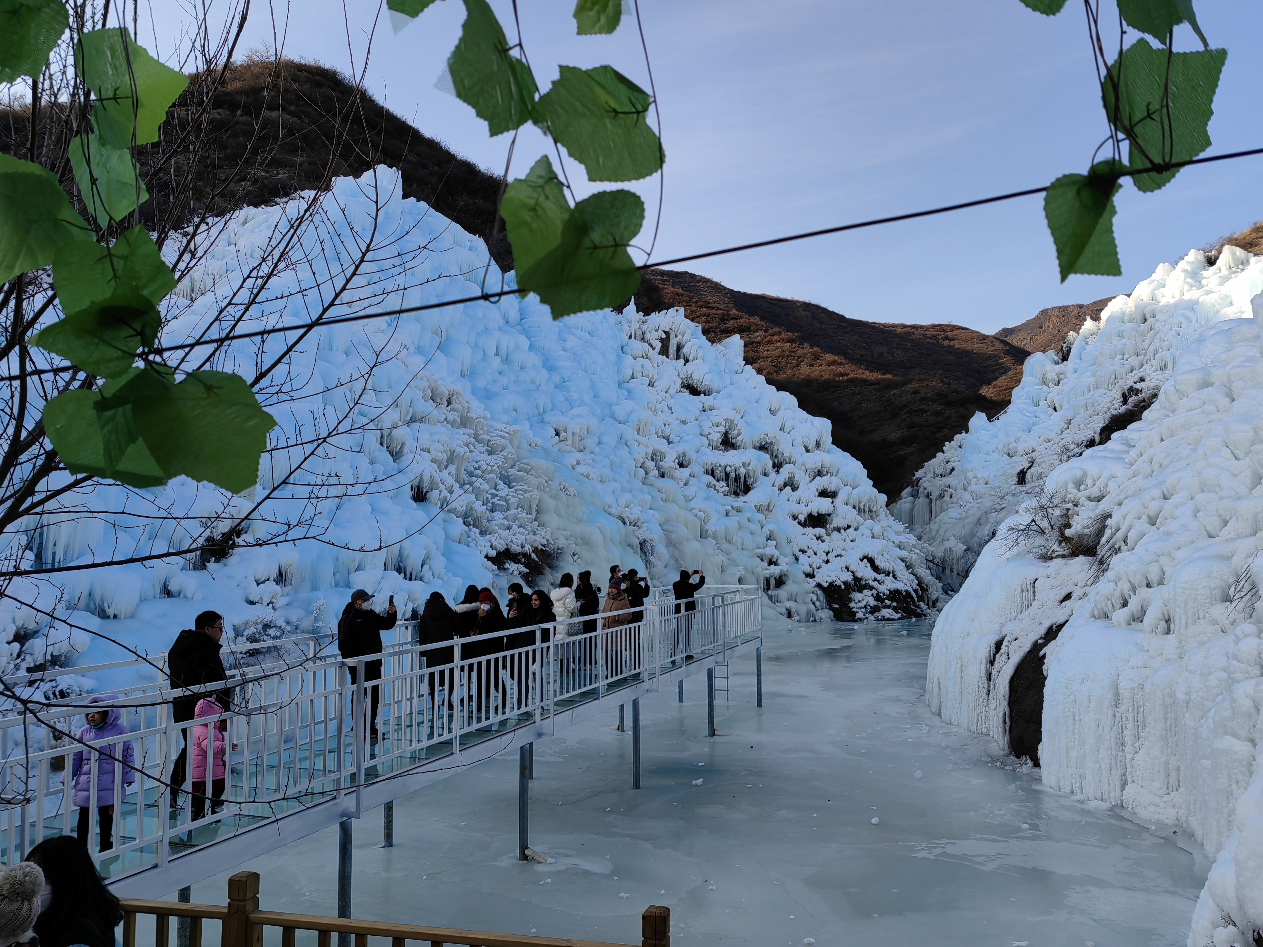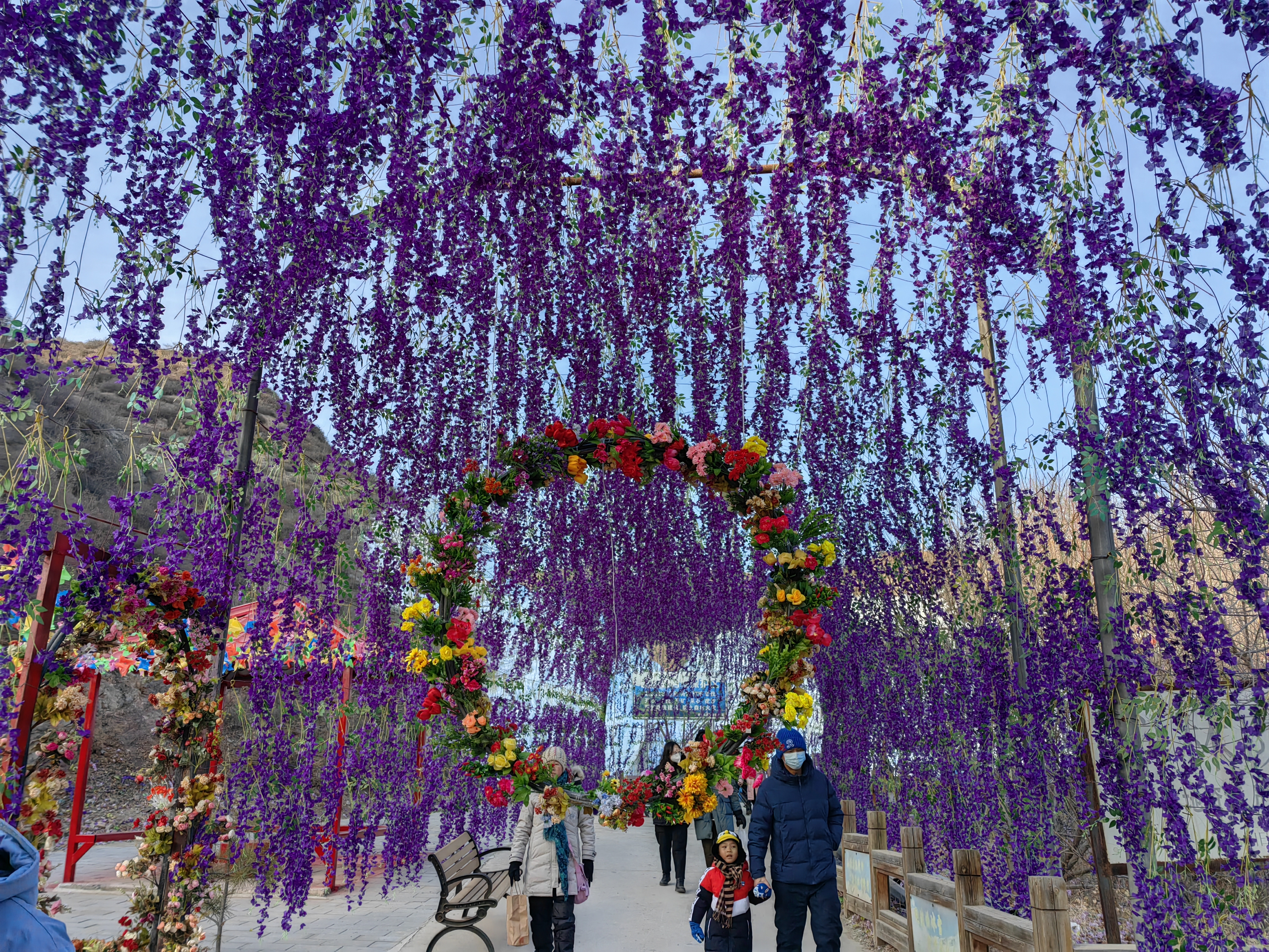 穿过由紫色藤蔓和大红灯笼装饰的长廊,山谷中的冰柱、冰瀑、冰挂连成一片,一团团一簇簇,一派晶莹剔透、银装素裹的景象,在冬日暖阳的照射下,冰瀑瑰丽夺目,回首远眺,冰凌与灌木丛连在一起相映成趣。侧耳倾听,潺潺泉水叮咚作响,演奏着冬日里最灵动的乐章,每一帧画面都展现着大山中最绚烂的北国风光。