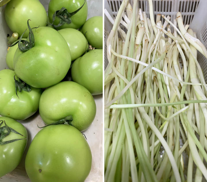 青番茄和水芹菜也是这里的特色菜。青番茄和红番茄相比,口感更加爽脆,酸味更清透,和咸肉炒在一直简直是绝配。