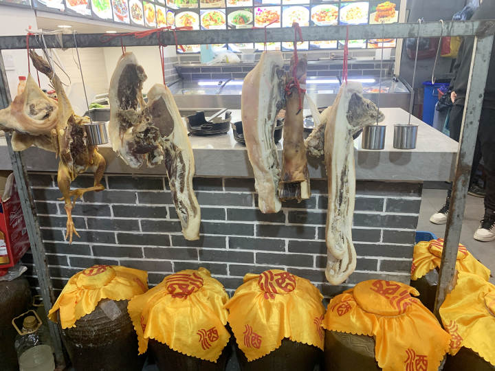 走进店里,已经能感觉到满满的过年气氛。架子上挂着腌好的土猪咸肉,地上的坛子里装着各种土烧。荞麦烧、五粮烧、谷烧……都是开化老乡爱喝的品种。
