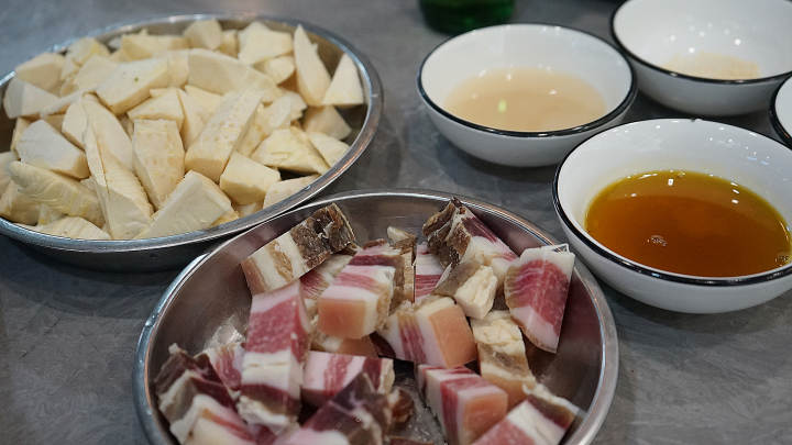 余军说,做好这道菜的关键是食材。现在开化当地新挖的冬笋特别鲜甜,今年腌的咸肉也可以吃了。另外,农家菜籽油和自己熬的猪油也不能少,必须要用这两种油一起炒,才能把这道菜炖的既美味,颜色又漂亮,让人一看就想吃。