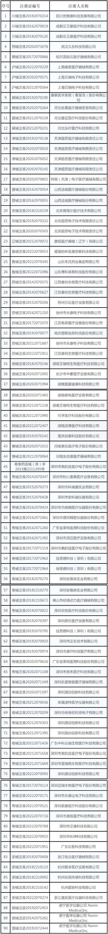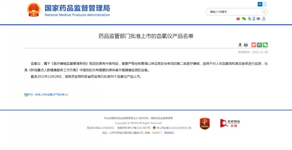 据上游新闻了解,国家药品监督管理局在去年12月28日发布了一则公告,公告标题为《药品监管部门批准上市的血氧仪产品名单》,其对截至2022年12月28日国家药监局和各省药监局已批准的90个血氧仪产品进行了公示,具体信息如下: