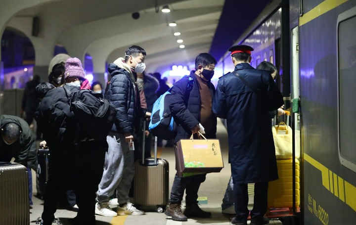 1月7日凌晨,在山东省滕州市火车站,旅客在站台乘车。新华社发(李志军摄)