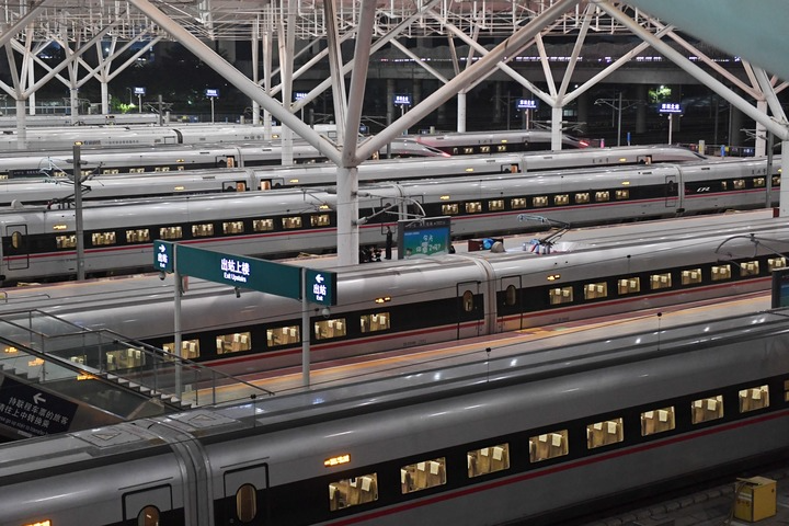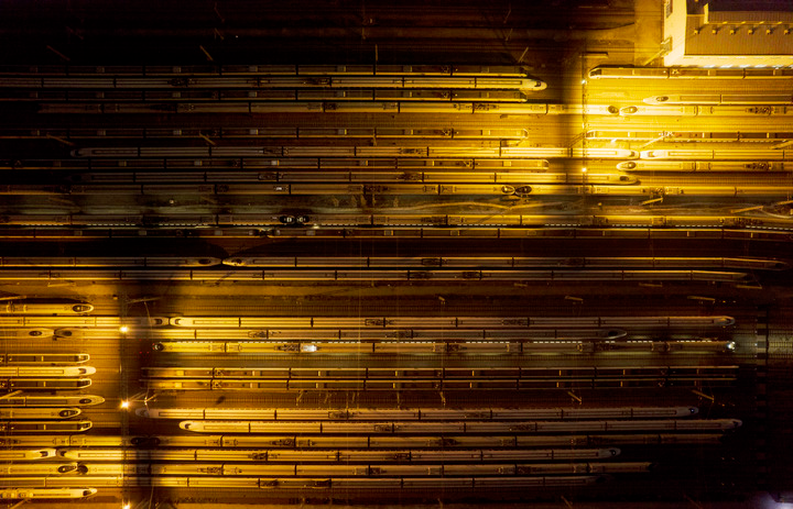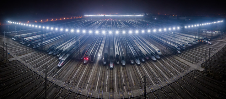 1月7日凌晨,动车组列车停靠在武汉动车段的存车线上(无人机拼接照片)。新华社记者伍志尊摄