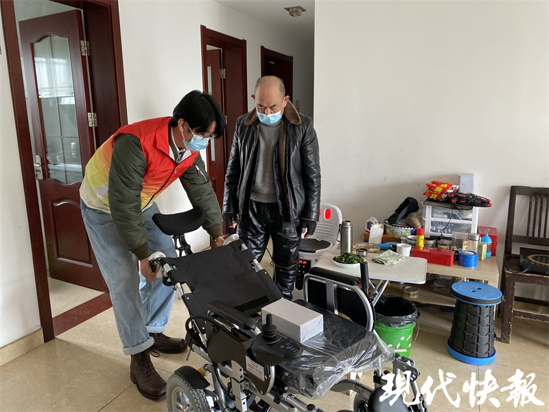 1月10日,陈迎青与党建共建单位苏州市烟草专卖局党建办主任蒋育宇一同,将这部特别的电动轮椅送到了吴炳兴的家中。