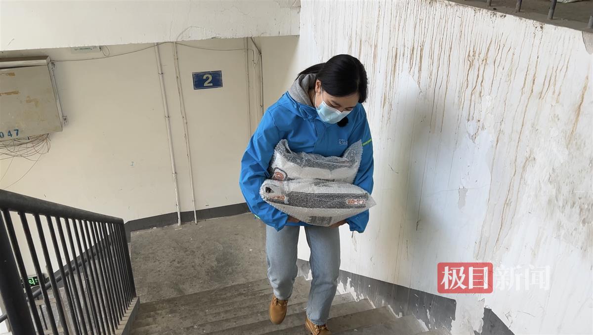 其中一单,有用户购买了6个包裹,包括2袋共40斤重的大米,还有两箱牛奶和一箱坚果。记者到了住户楼下却傻了眼:要上6楼,没有电梯!电话联系后,对方表示自己在家,直接上门即可。为了将所有货物送上门,记者只能分两次搬运,先搬上两袋大米,再下楼拿两箱牛奶和坚果,多跑一趟。当住户开门收件时,出来的是一位婆婆。看到年轻的女快递员,婆婆先是一愣,看记者仍弯腰准备将快递帮其抱进屋内,婆婆连声说家里有人,让记者不用搬,接着又连声道谢。