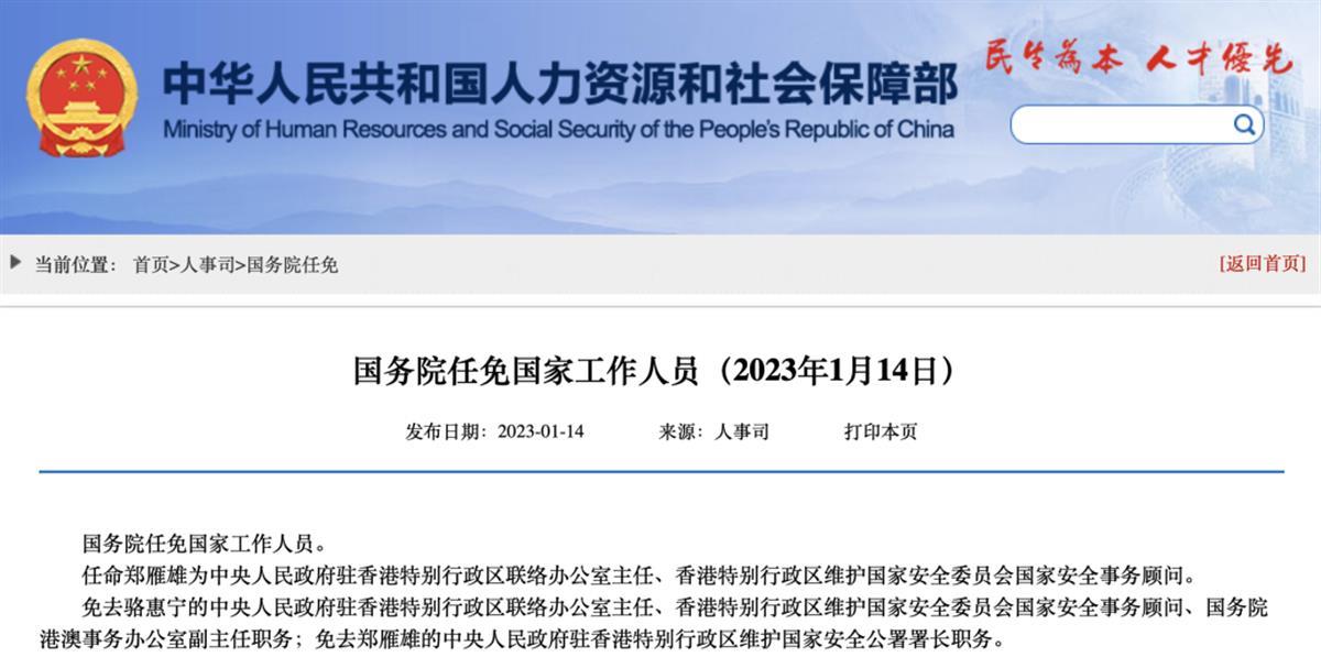 任命郑雁雄为中央人民政府驻香港特别行政区联络办公室主任、香港特别行政区维护国家安全委员会国家安全事务顾问。