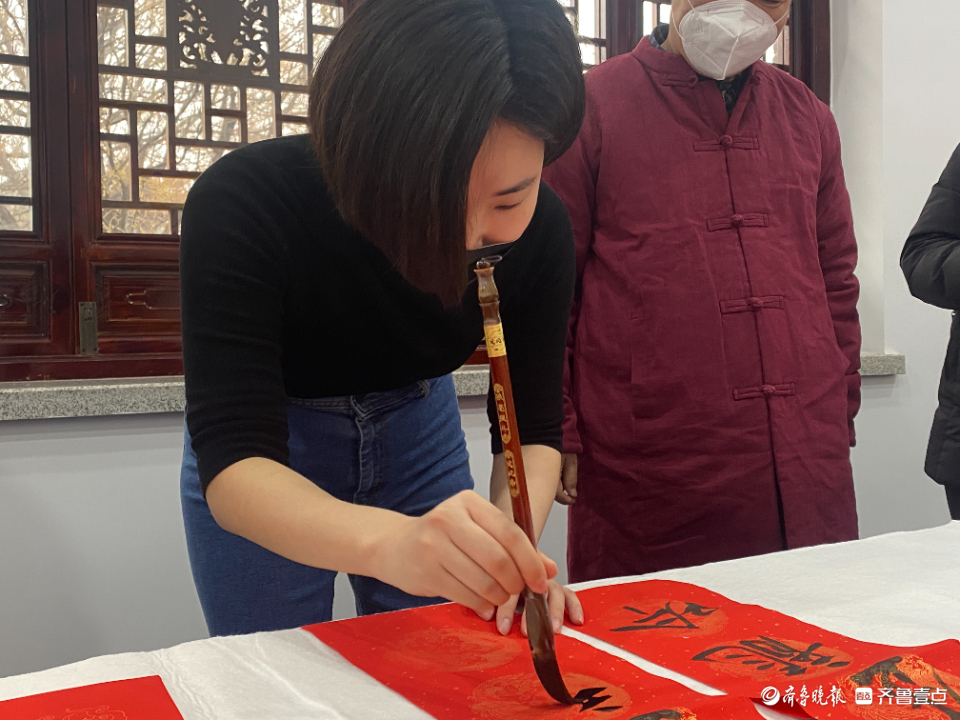 当6位外国朋友来到聊城水上古城“聊城·中东欧之家”时,市书法家协会主席方建光已经在此恭候。看到一张张红纸和空白的春联,外国友人在方建光等聊城书法家的指点下,拿起毛笔写起大红“福”字来。当成保炅写完一副春联“今岁欣看玉兔舞来年喜听金龙吟”时,她掩饰不住内心的喜悦,拿起这幅春联展示给中外朋友。此时,萨利赫也写完一个大红“福”和“新年快乐”。方建光不住地给予鼓励和赞赏。与此同时,法希姆、胡梅拉、乔希也依次写出了大红“福”字。最后,6位外国友人与中国书法家拿起自己写的大红“福”字向众人展示并合影留念。