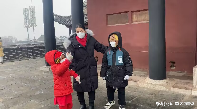 1月13日下午,来自尼泊尔的聊城大学外国专家乔希及来自巴基斯坦的法希姆一家四口,与韩国友人成保炅在翻译和聊城友人的陪同下,登上光岳楼,欣赏鲁班塑像“巧夺天工”。“哇,这是仙人指路吧?”巴基斯坦小朋友萨利赫脱口而出。随后,6位外国友人在光岳楼讲解员刘贤的引导下,观看了光岳楼专题片,对光岳楼600余年风风雨雨的历史进行了系统了解。再上一层就是乾隆行宫,巴基斯坦小朋友萨利赫和欧麦玛好奇地与乾隆塑像合影。乔希边欣赏光岳楼的建筑,边不住地赞叹,当听到刘贤说,光岳楼全部都是木质结构,并且多次修旧如旧时,他伸出了大拇指。登上光岳楼顶层后,外国友人们纷纷拍照留念,似乎尽力留住登楼的美好时光。