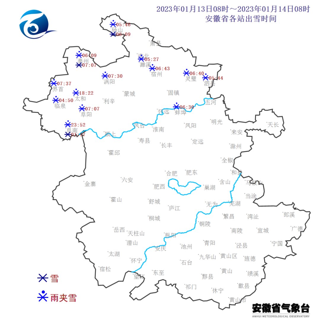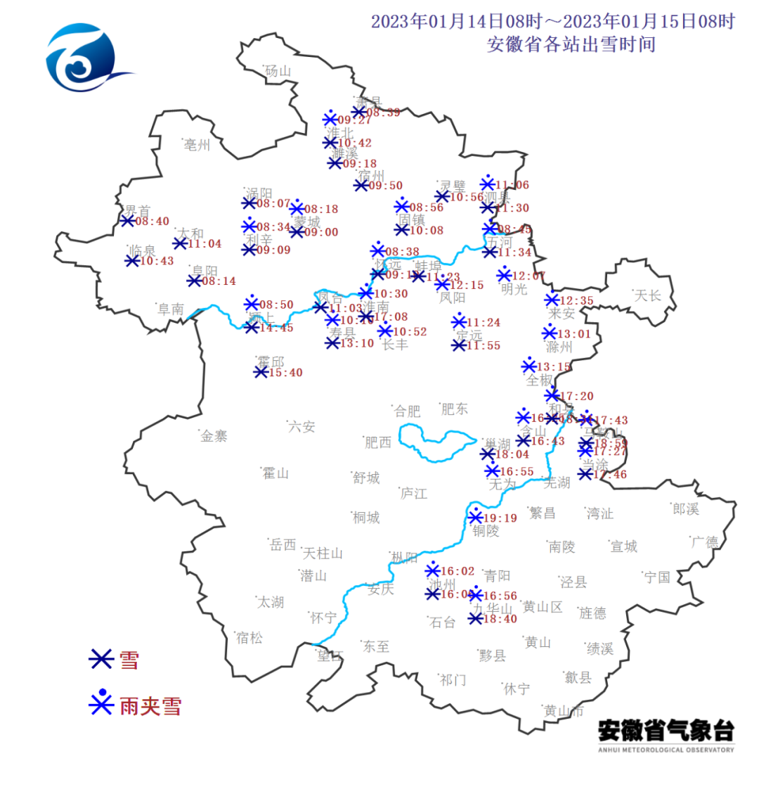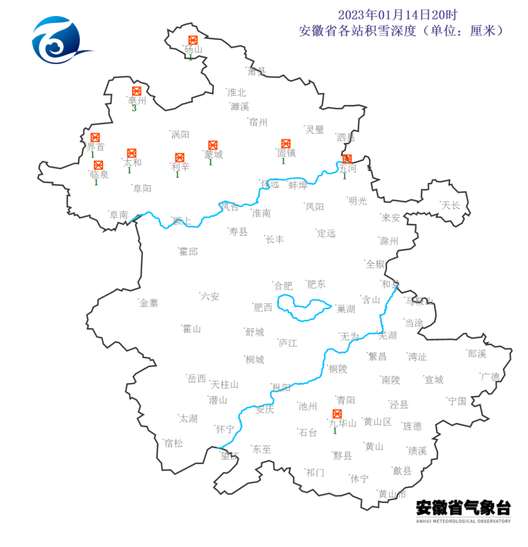积雪情况:14日20时,全省有10个站出现积雪:亳州3厘米,砀山、界首、太和、临泉、蒙城、利辛、固镇、五河、九华山1厘米。