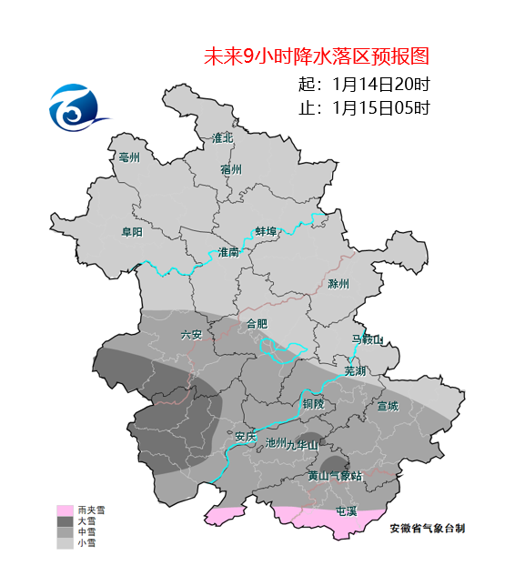 预计14日20时-15日05时,淮北地区有小雪,江淮之间有小到中雪,江南有小雨或雨夹雪转小到中雪,其中大别山区和皖南山区大雪。