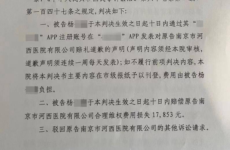 据此,建邺法院作出一审判决,被告杨某在社交平台账号发表对原告河西医院公司赔礼道歉的声明;赔偿原告合理维权费用损失1.7万余元。