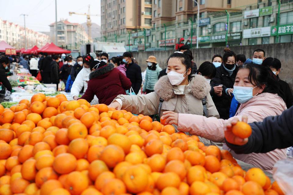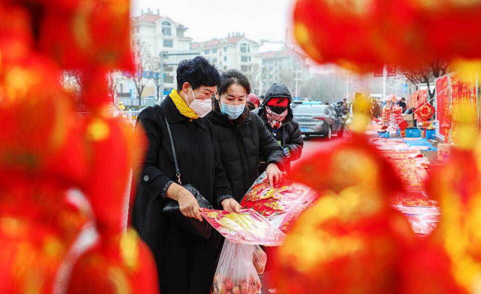“你看咱这张村大集真热闹,一眼望不到头,全是好东西。大集逛一圈,年货办全了。”东莱海居民郭菊芳一大早就和妯娌张廷松结伴来逛大集,手上的大包小裹沉甸甸的,“日子越来越红火,今年年货买得格外多。”走进熙熙攘攘的人群,春联、糖果、鸡鸭、果蔬、牛羊肉等商品琳琅满目。对联摊位格外鲜艳喜庆,红色的彩带随风摇曳,大红灯笼迎风起舞,张张“福”字、春联喜迎新春。各个摊位中,水果也是热销品。苹果、砂糖橘、香蕉和草莓都很受欢迎。“今天先买点砂糖橘和蔬菜,一会准备再去买些对联,快过年了,给家里增添点年味儿。