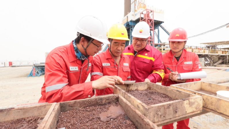 塔里木油田技术人员在满深10井分析地层岩屑(央广网发塔里木油田供图)